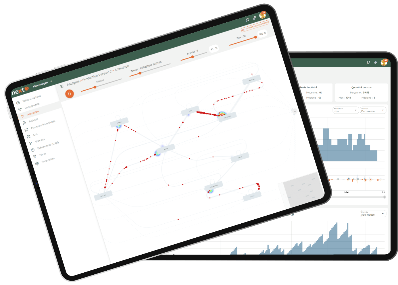 FlowAnalyser is one of the applications available within NEXT, designed to leverage your data and provide a clear, shared view of your flows. To go further, ProcessEval can be used for on‑site audits and detailed assessment, while TaskFlow supports structuring and managing improvement projects.